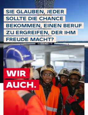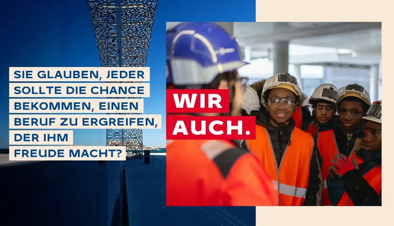 Bei VINCI sind wir überzeugt davon, dass jeder dieselbe Chance auf Erfolg verdient. Jedes Jahr bieten wir 5000 jungen Menschen aus Brennpunktvierteln und ländlichen Gebieten ein Programm zum Kennenlernen unserer Tätigkeitsbereiche und Berufe, die dazu beitragen, die Stadt von morgen zu gestalten.